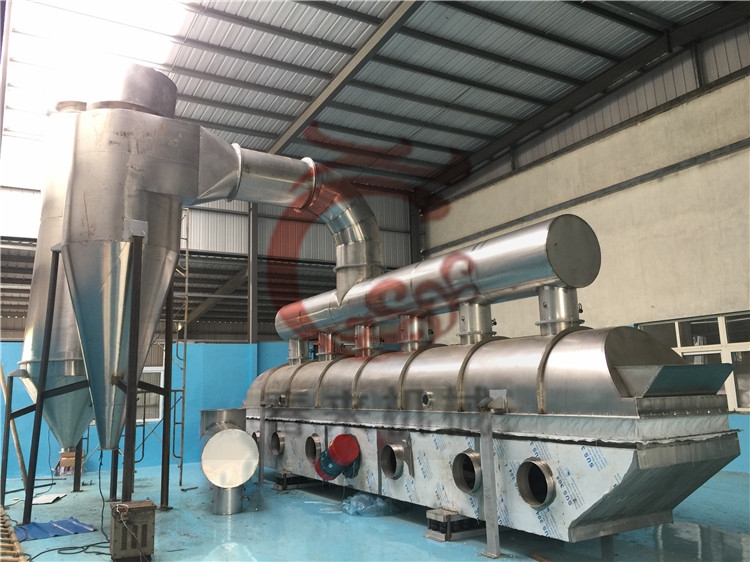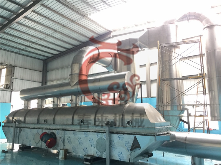 物料自进料进口进入机内,在振动力作用下,物料沿水平面流化床抛掷,向前连续运动,热风向上穿过流化床同湿物料换热后,湿空气经旋风分离器除尘后由排风1:3排出.干燥物料由排料进口排出。