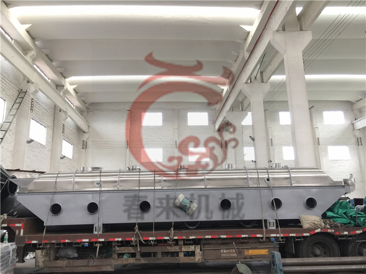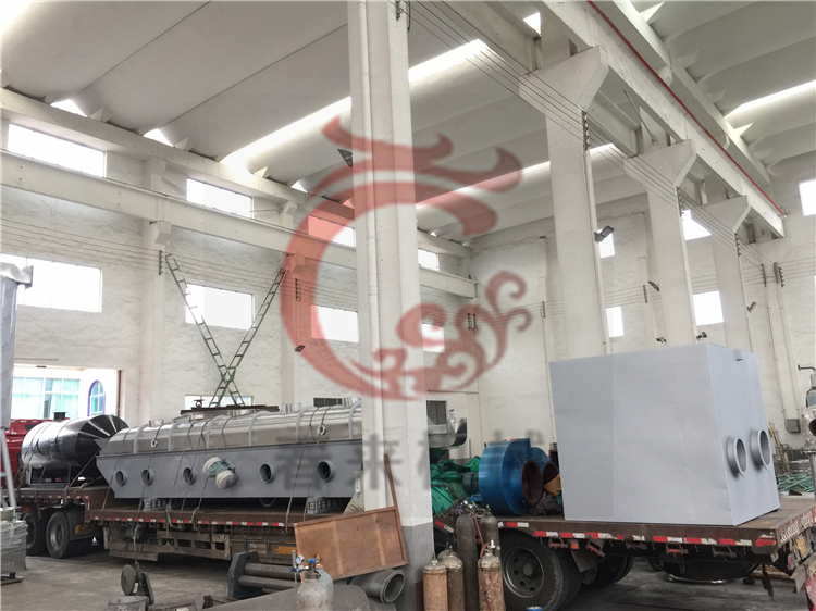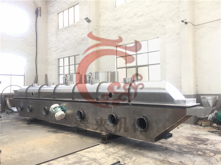 物料自进料进口进入机内,在振动力作用下,物料沿水平面流化床抛掷,向前连续运动,热风向上穿过流化床同湿物料换热后,湿空气经旋风分离器除尘后由排风1:3排出.干燥物料由排料进口排出。